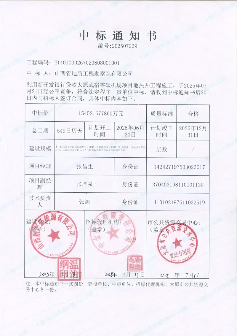 近日,问鼎网页版登录入口成功中标利用新开发银行贷款太原武宿零碳机场项目地热井工程施工项目,中标金额15452.67786万元。